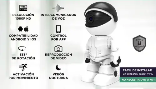 La Mini Smart Robot Camera es ideal para cuidar tu hogar con total tranquilidad. Ofrece resolución HD 1080p, conexión Wi-Fi y acceso en vivo desde tu celular. Su visión 360° motorizada y visión nocturna permiten un monitoreo completo, de día y de noche. Diseño compacto y discreto, perfecta para seguridad del hogar o control de ambientes.